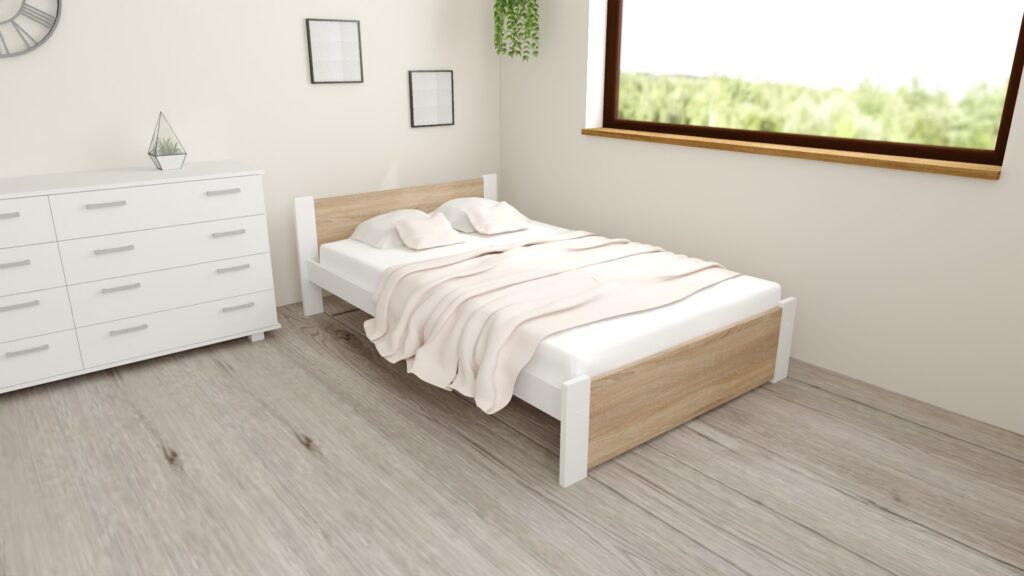 Łóżko D3 to nowoczesna ponadczasowa konstrukcja zaprojektowana zgodnie z panującymi trendami, model ten jest połączeniem wysokiej jakości płyty meblowej w kolorze dębu sonoma razem z nogami w kolorze bieli. Konstrukcja drewniana w połączeniu z płytą meblowa zapewnia najwyższą stabilność łóżka.