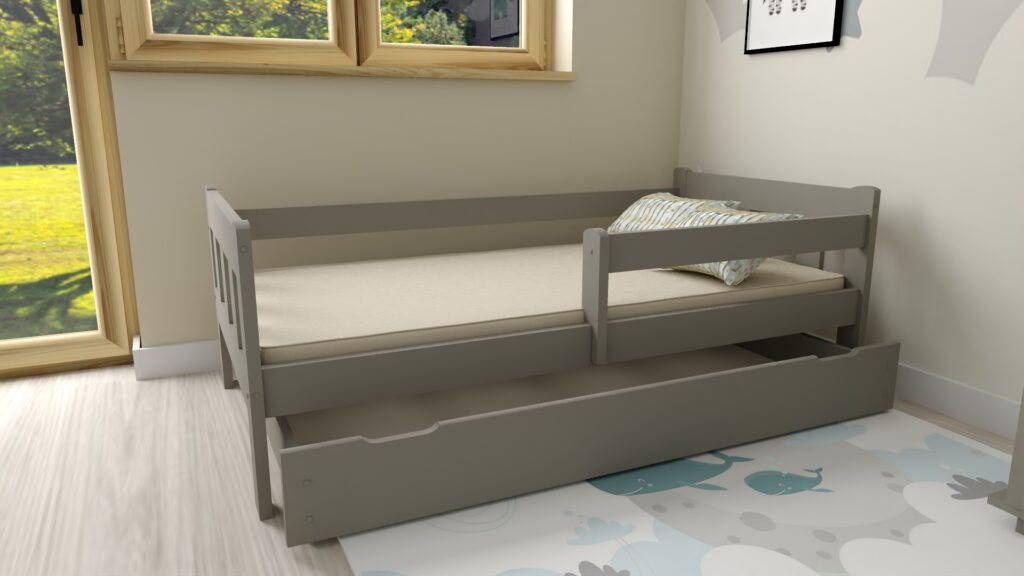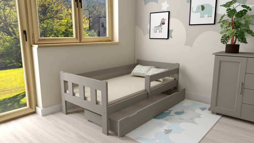 ZESTAW ŁÓŻKO DZIECIĘCE MAJA 80×200 Szare z szufladą i materacem piankowym