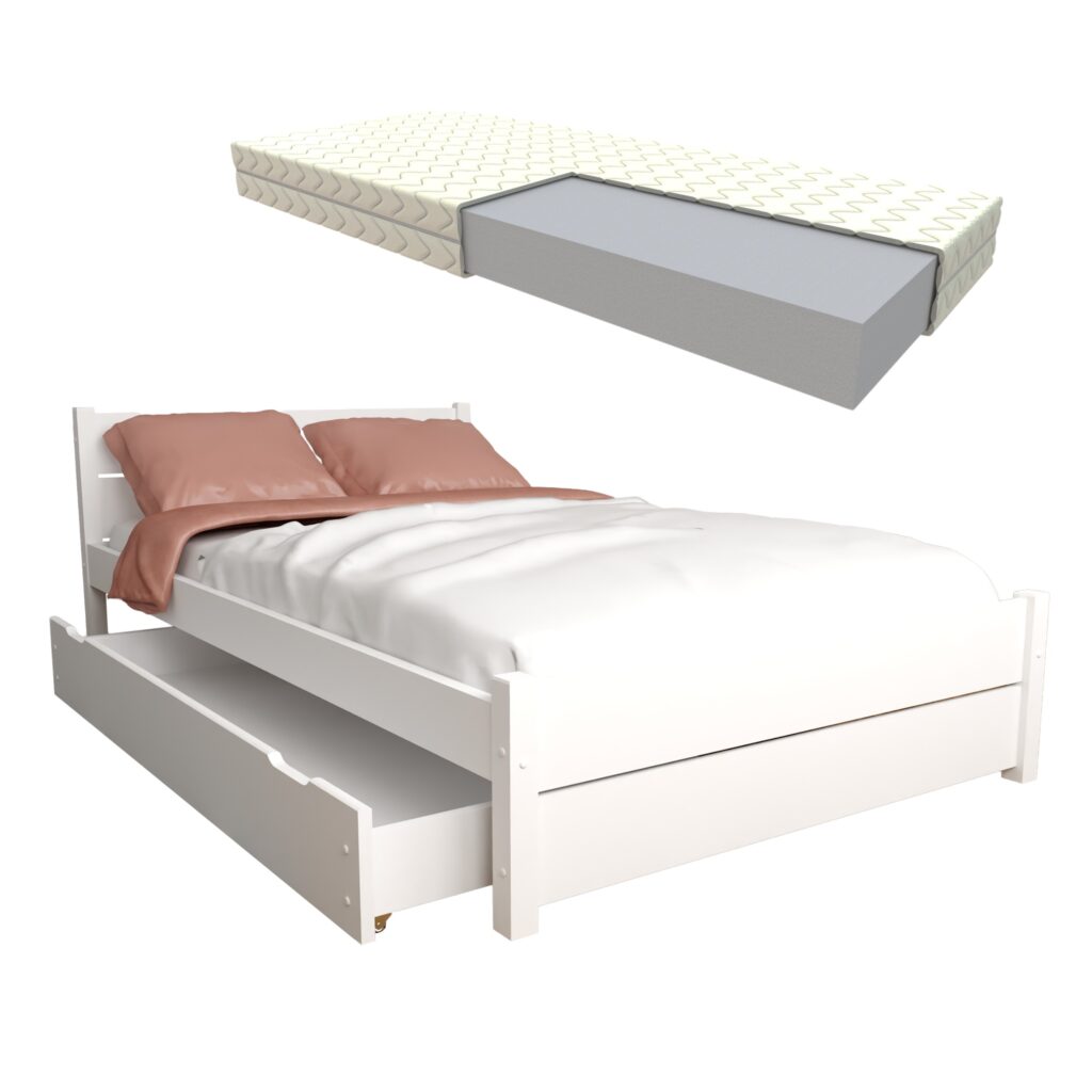 ZESTAW ŁÓŻKO LAURA 160×200 Białe z szufladą i materacem piankowym